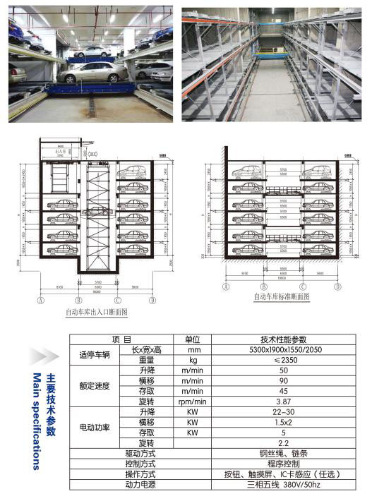 运行原理及特点 采用在同一层上用搬运台车或起重机平面移动,或使载车板平面横移实现存取停放车辆,亦可用搬运台车和升降机配合实现多层平面移动存取停放车辆。此种类型的设备大多为多层平面移动类,这种车库可以建